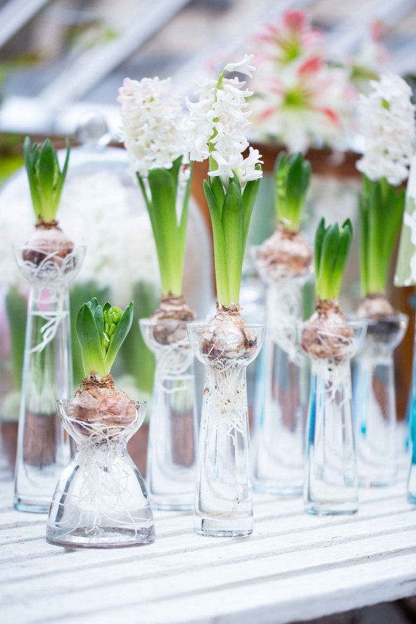 En favorit är att placera hyacinter i glasvaser. Det finns speciellt framtagna hyacintvaser som har en midja i vasen där löken placeras för att rötterna sedan ska kunna dingla ner i vattnet. Har du inte det fungerar det också bra med till exempel ett stabilt champagneglas. För att få det att se vackert ut krävs dock att du sköljer rötterna helt rena från jord.